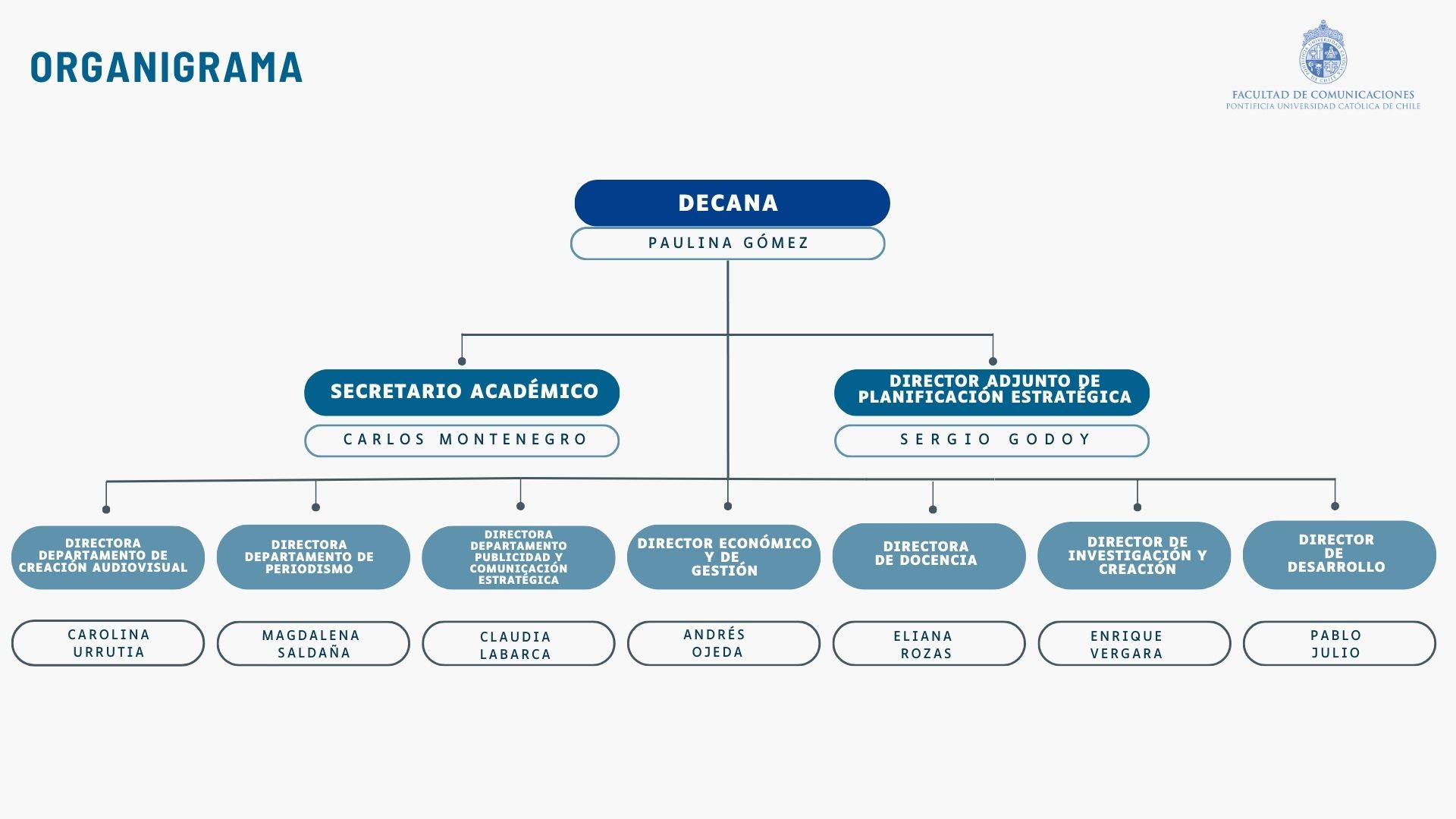 La integran tres departamentos: Periodismo, Comunicación Estratégica, y Creación Audiovisual y Publicidad, cada uno a cargo de impartir una las tres carreras de pregrado: Periodismo (desde 1961), Dirección Audiovisual (2003) y Publicidad (2012), además de tres programas de magíster y diversos cursos y diplomados.